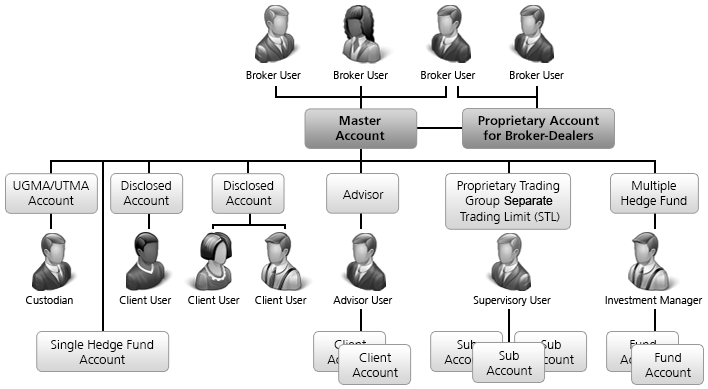 Offengelegte Broker können die folgenden Konten zu Ihrer Brokerkontostruktur hinzufügen: Beraterkonten, Konten mit getrennten Handelslimiten (STL) für Proprietary-Trading-Gesellschaften und Multi-Hedgefonds-Master-Konten. Die jeweiligen Inhaber der Beraterkonten, Konten mit getrennten Handelslimiten (STL) von Proprietary-Trading-Gesellschaften und Multi-Hedgefonds-Master-Konten können nach Bedarf wiederum Kundenkonten, Unterkonten und Hedgefonds-Konten hinzufügen.