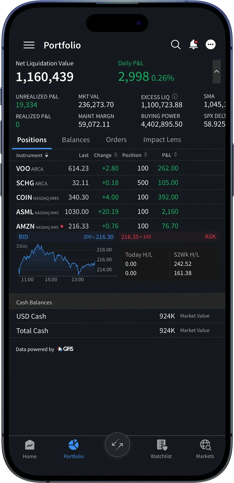 Track performance, monitor positions, and adjust your investments from anywhere. IBKR Mobile provides the insight and control of professional desktop tools so you can make informed decisions and act quickly, even on the go.